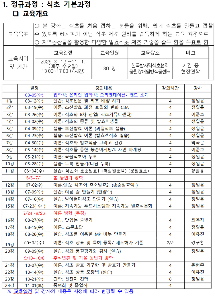 – 각 과정별 필요 경비 / 식초 기본과정 :300,000원 / 식초 응용과정 :300,000원