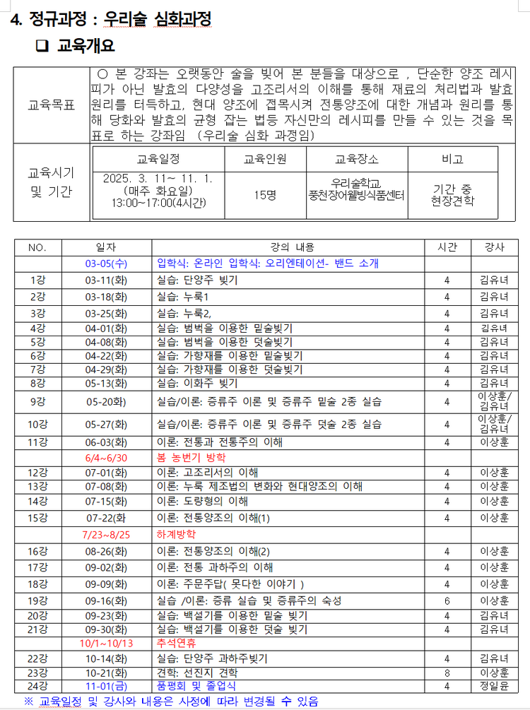 우리술 입문과정: 300,000원 / 우리술 심화과정: 300,000원